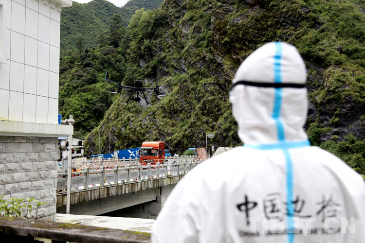 圖為民警正在使用無人機對貨運通關(guān)現(xiàn)場進行實時監(jiān)測 攝影:尼瑪?shù)┰?/p>
