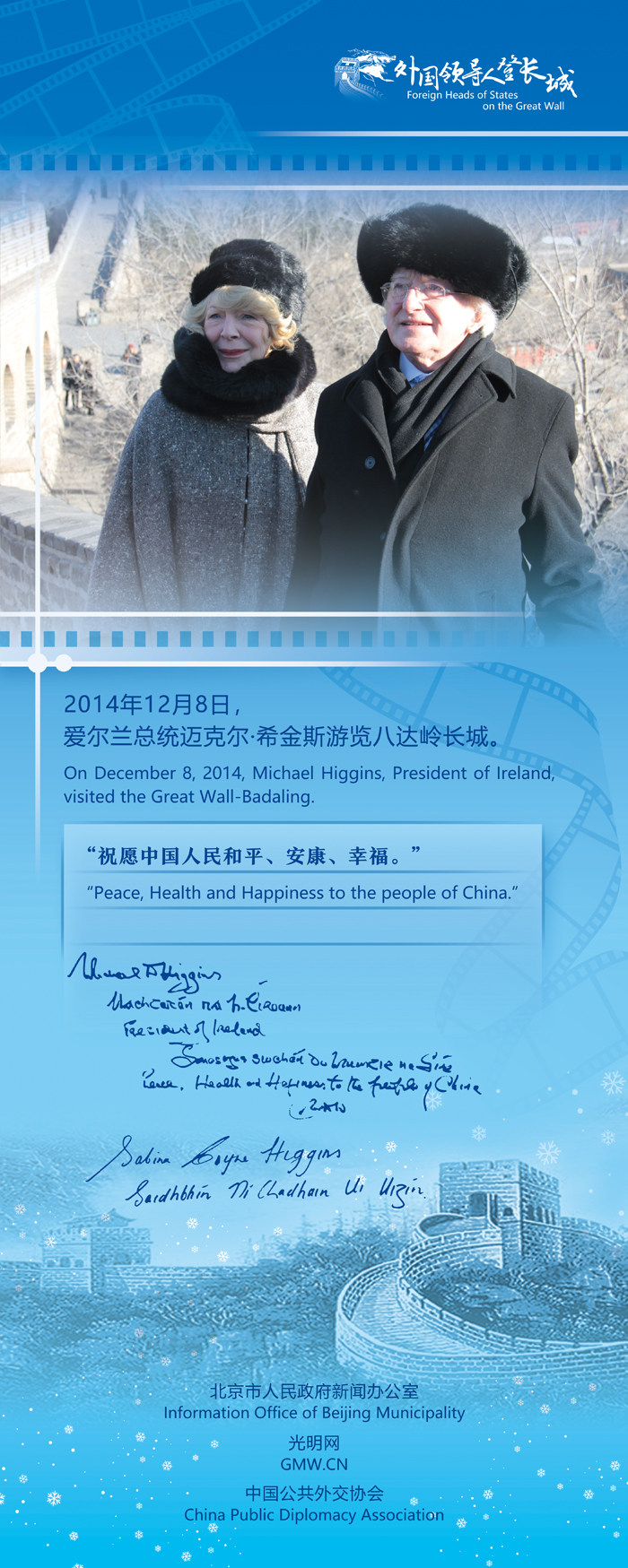 中國長城,巍峨峻拔,氣勢磅礴,縱橫兩萬余公里,是中華民族勤勞智慧的歷史結(jié)晶,也是世界歷史文化奇跡。2014年的冬日,位于中國北京的八達(dá)嶺長城迎來了一位特別的游客——愛爾蘭總統(tǒng)邁克爾·希金斯。