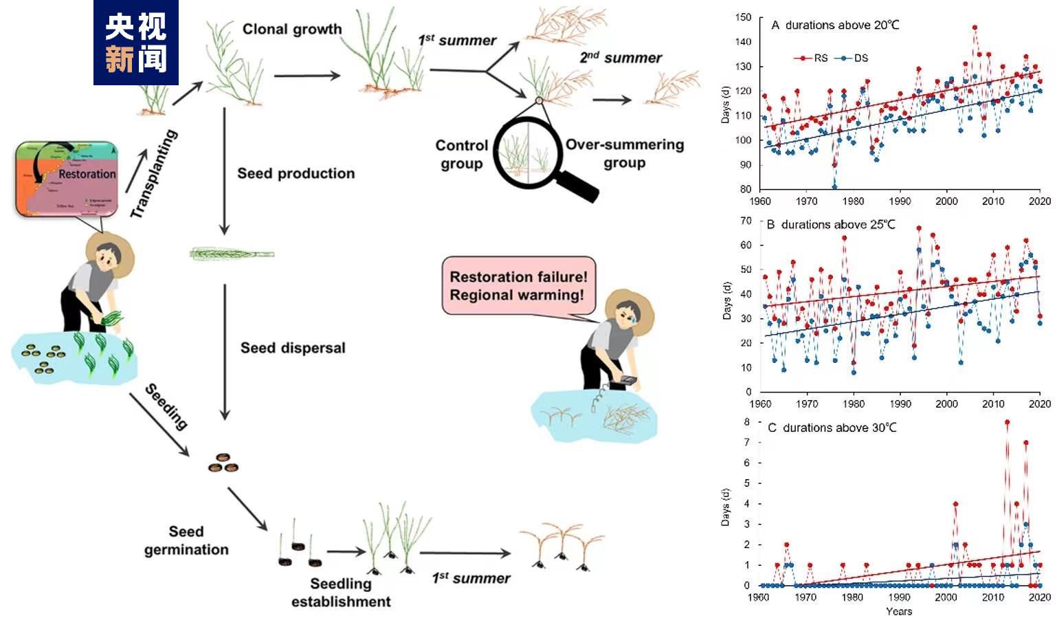 為確定鰻草地理分布北移是否由區(qū)域變暖所致,2016年至2021年期間,科研人員從青島灣獲取鰻草植株和種子,在日照石臼所海域共開展了16次鰻草植株移植和種子種植實驗,監(jiān)測海草生長狀況及水溫等環(huán)境參數,并進行海草生化分析和轉錄組分析。