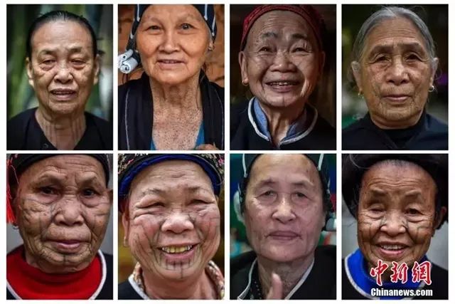 資料圖:黎族繡面文身承載著自母系氏族至今的歷史,是民族文化的“活化石”。圖為來自不同方言區(qū)的最后一代黎族繡面文身女子。駱云飛 攝