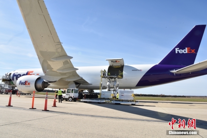 當?shù)貢r間11月8日,美國華盛頓史密森學會國家動物園的大熊貓“美香”“添添”和它們的幼崽“小奇跡”乘坐的專機從華盛頓杜勒斯國際機場起飛前往中國成都。圖為裝有大熊貓的特制“旅行箱”正在運上專機。<a target='_blank' href='/'><p  align=中新社記者 沙晗汀 攝">