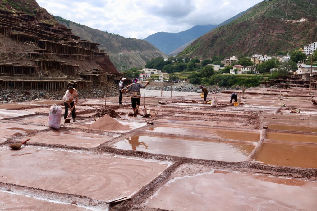 當地村民仍保持著原始的手工曬鹽方式,他們從瀾滄江畔的鹽井、鹽池中取出鹵水倒入鹽田,經陽光蒸曬、風干,結晶成鹽。遠遠望去,鹽田錯落有致,景色奇美。