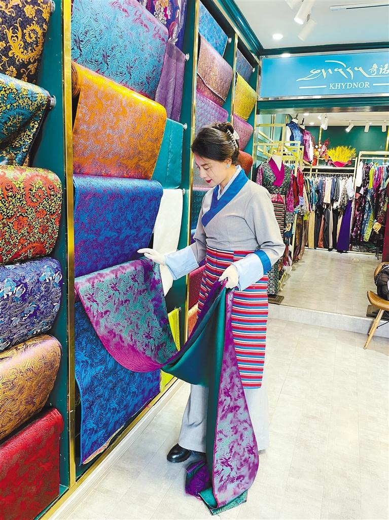 拉薩市某藏裝店商家在整理貨架上的布料。 記者 次吉 攝