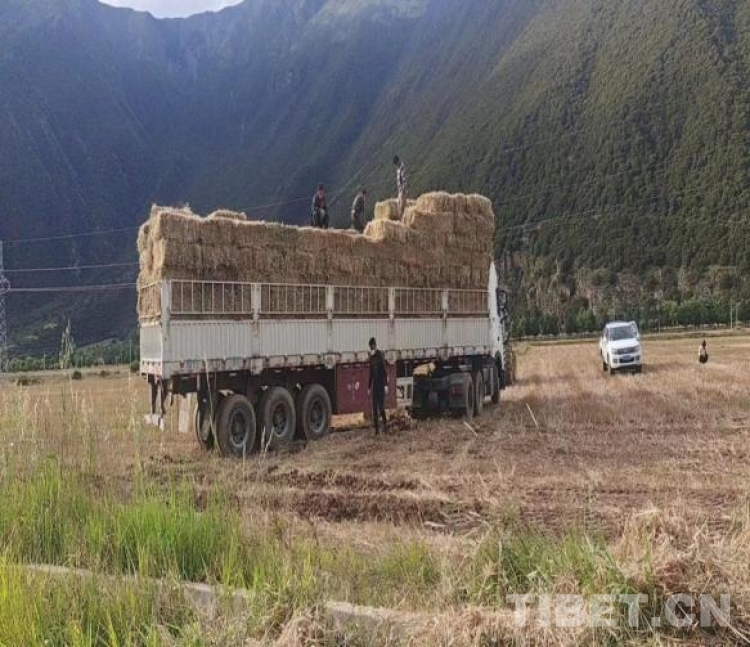 圖為國(guó)家牧草產(chǎn)業(yè)技術(shù)體系拉薩綜合試驗(yàn)站工布江達(dá)縣示范點(diǎn)秋收搶收(海拔3990米)打捆裝車(chē)的牧草