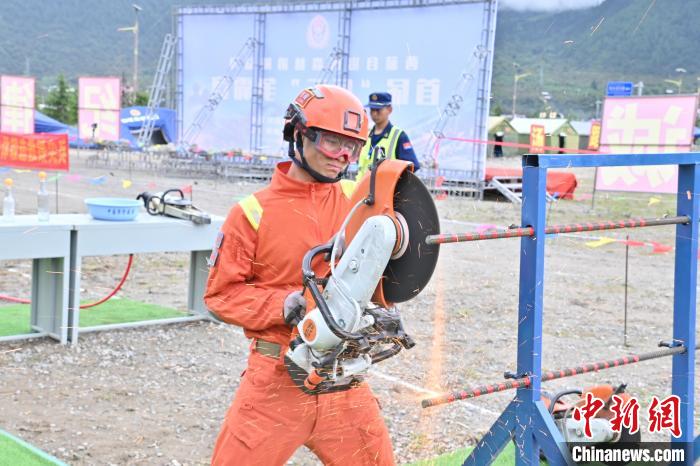 圖為地震救援專業(yè)“兵王”許沖正在操作內(nèi)燃無(wú)齒鋸。西藏森林消防總隊(duì)供圖