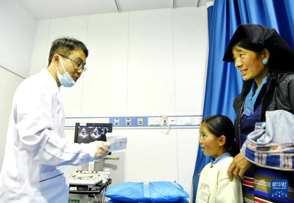 7月23日,南京醫(yī)科大學(xué)附屬兒童醫(yī)院副主任醫(yī)師胡銳在墨竹工卡縣與已做心臟超聲檢查的兒童及其家長交流。新華社記者 張汝鋒 攝