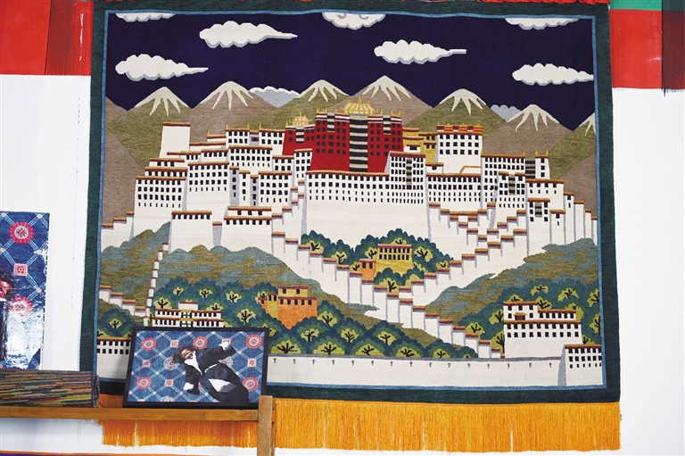 在藏毯廠陳列廳里,懸掛著一幅以布達(dá)拉宮為題材的藏毯?!把矍暗倪@幅藏毯已經(jīng)懸掛十年,沒(méi)有任何變形?!笨ν邎?jiān)藏毯廠工作人員彭志紅說(shuō),可見手工藏毯的質(zhì)量絕佳。