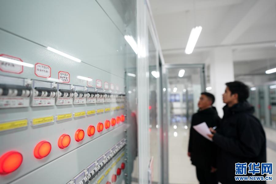 在西藏阿里與藏中電網(wǎng)聯(lián)網(wǎng)工程薩嘎220千伏變電站,工作人員查看設(shè)備運(yùn)行情況(2020年11月27日攝)。新華社記者 詹彥 攝