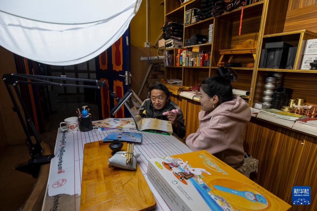 西藏拓崗文化傳播有限公司員工拉巴頓珠(左)與主播索朗德吉合作直播銷售藏語學習文具(11月10日攝)。新華社記者 姜帆 攝