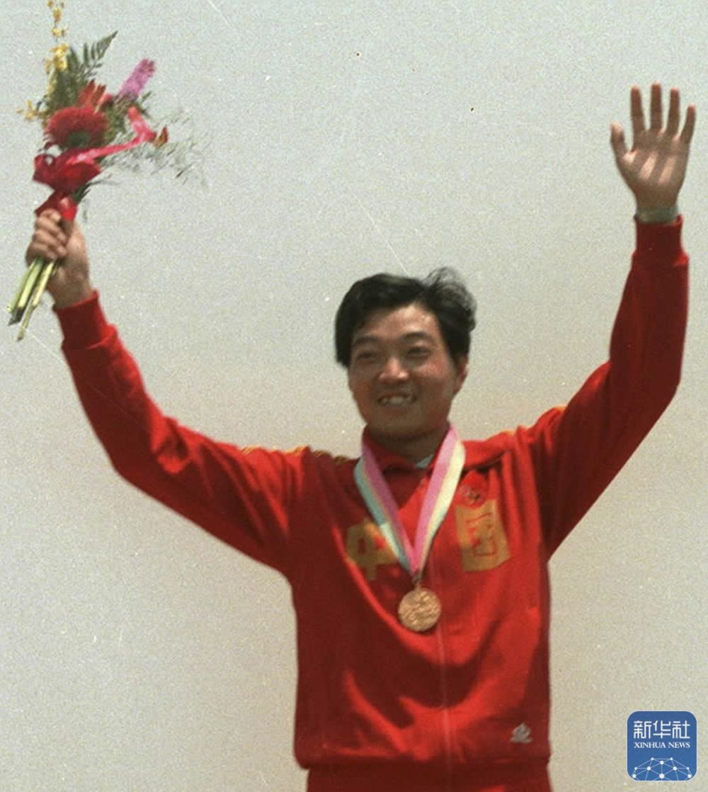 1984年洛杉磯奧運(yùn)會上,許海峰在獲得男子自選手槍項目冠軍后領(lǐng)獎(資料照片)。 新華社發(fā)