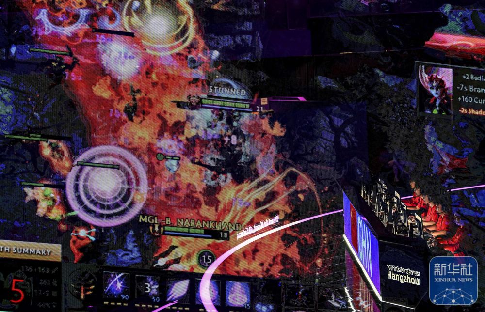 2023年10月2日,中國隊選手在比賽中(多重曝光照片)。 當(dāng)日,在杭州亞運(yùn)會電子競技項目刀塔決賽中,中國隊以2比1戰(zhàn)勝蒙古國隊,獲得冠軍。 新華社記者 顏麟蘊(yùn) 攝