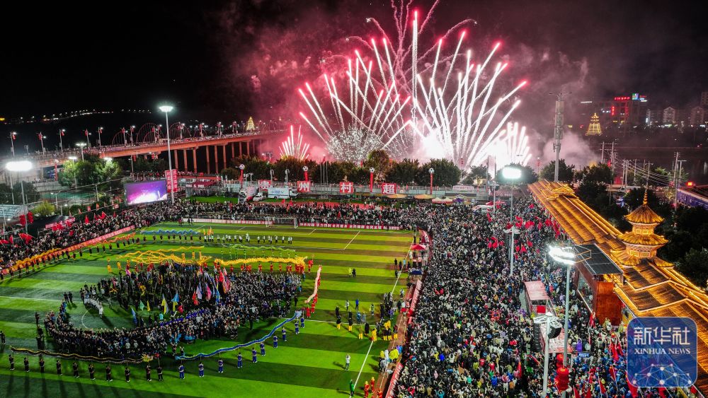 2024年2月3日,音樂煙花秀在“村晚”上演(無人機(jī)照片)。當(dāng)日,2024全國“村晚”示范展示活動暨貴州“村超村晚”在貴州省黔東南苗族侗族自治州榕江縣拉開帷幕。活動包括“村超村晚”文藝展示、2024龍年“村超”賀歲戰(zhàn)等內(nèi)容。新華社記者 劉續(xù) 攝