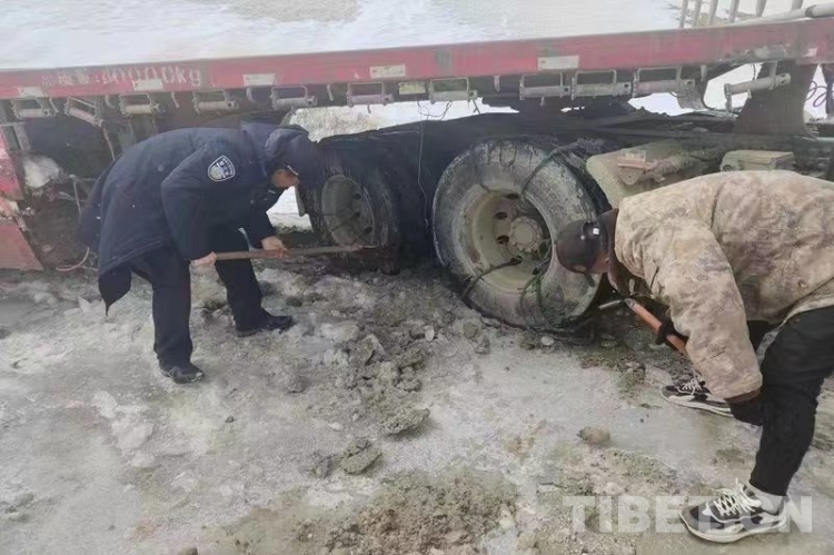 西藏阿里:半掛車夜陷雪地 移民警察助脫困