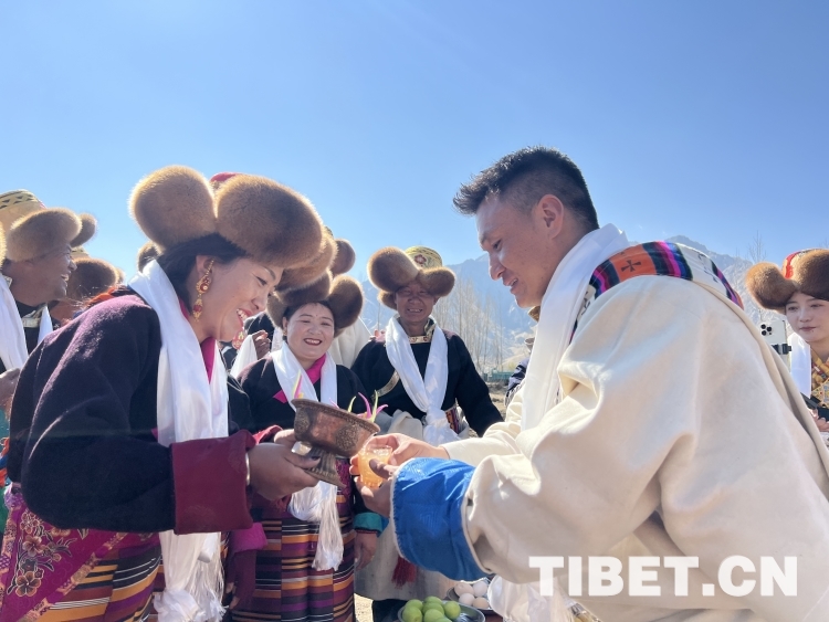 開耕儀式結(jié)束后,茶巴朗村藏戲隊成員們?yōu)樵缫褤Q好藏裝過來體驗西藏民俗文化的游客們獻哈達、敬青稞酒、唱敬酒歌,游客們現(xiàn)場學(xué)起“三口一杯”與當?shù)厝斯捕冗@美好的一天。西藏卓美旅行社負責(zé)人孫赫男介紹說:“西藏除了山水美景之外,春耕儀式也是非常具有當?shù)靥厣奈幕?,能給人留下深刻記憶。今天,我?guī)е鴣碜员鄙蠌V等全國各地的游客來這里體驗春耕儀式,讓大家看看西藏當?shù)氐娜罕娛窃鯓娱_始春天的。游客們穿著藏裝,免費品嘗青稞酒、酥油茶、牛肉、藏雞蛋等各種農(nóng)產(chǎn)品,還和充滿熱情的當?shù)卮迕駛兓樱麄兺娴梅浅i_心。”