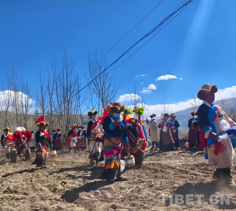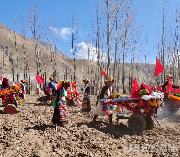 當(dāng)天,村里的男女老少穿上節(jié)日盛裝,手捧哈達(dá),高舉青稞美酒,從村子的各個角落來到村東頭一塊叫作“聶西滅”的肥沃土地上,男人們駕駛著用彩旗、花束妝點的拖拉機(jī),伴隨著一陣陣轟鳴聲,春耕儀式正式開始。新耕的第一犁,由一個屬相與今年屬相相符的婦女撒出吉祥、幸運的種子,其余的拖拉機(jī)一對跟著一對地翻耕,每臺拖拉機(jī)后面都跟隨著一位盛裝的婦女,她們左手提一桶種子,右手有節(jié)奏地?fù)]擺,翻出沉寂一冬、透著泥土芬芳的肥沃土地,把種子撒入希望的田野。翻耕結(jié)束后,各家各戶把春耕歡慶時用的青稞酒、卡賽、切瑪?shù)葦[放在供桌上,孩子們在田間喧鬧戲耍,將村民們其樂融融、喜氣洋洋的美好生活景象體現(xiàn)的淋漓盡致。