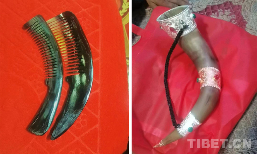 圖為麻木卓瑪管理站站長洛達用牦牛角制作的梳子和酒器 (洛達供圖)