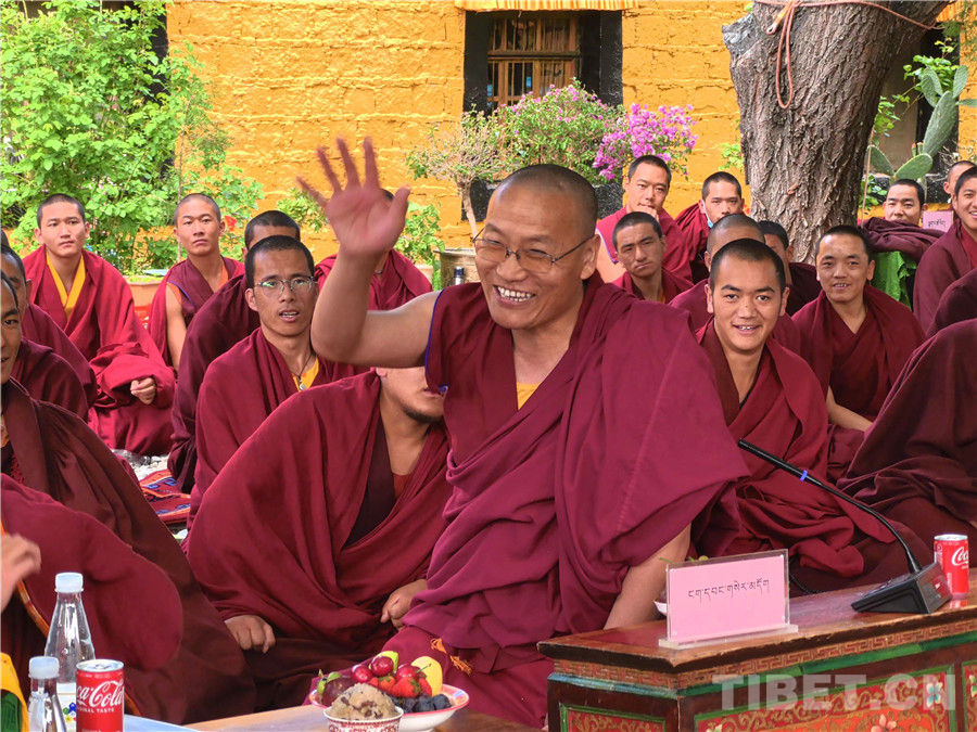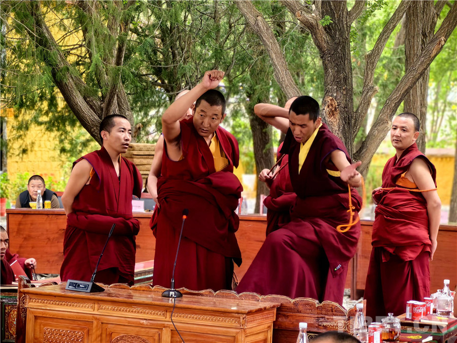 午后的陽(yáng)光慵懶地灑在辯經(jīng)場(chǎng),卻擋不住辯經(jīng)的智者們爭(zhēng)先恐后、高舉手臂提問(wèn),手臂向下?lián)]落,象征著智慧之劍砍向無(wú)知。熱烈的氣氛中,智者們拍手擊掌、獨(dú)立頓足、舞動(dòng)佛珠、慷慨陳詞、大聲質(zhì)問(wèn),仿佛如此便得到了無(wú)窮的智慧。活動(dòng)現(xiàn)場(chǎng)氣氛十分熱烈、精彩紛呈,交流內(nèi)容充實(shí)飽滿、將所學(xué)與實(shí)際相結(jié)合,充分展現(xiàn)了日常所學(xué)所思所得,閃光思維的碰撞迸發(fā)了智慧的火花,贏得了現(xiàn)場(chǎng)觀眾拍手叫絕,陣陣掌聲。