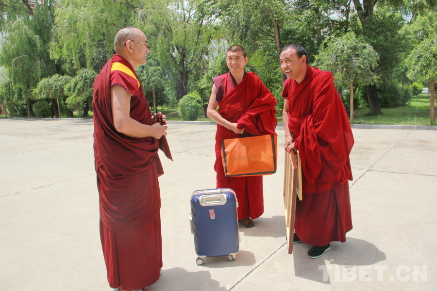 圖為青海省藏語系佛學院教務處副處長、特級經師悟嘉倉(左一)與準備離校的畢業(yè)學僧交談 攝影:劉莉