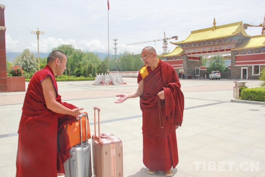 圖為青海省藏語系佛學院教務處副處長、特級經師悟嘉倉(右一)與準備離校的畢業(yè)學僧交談 攝影:劉莉