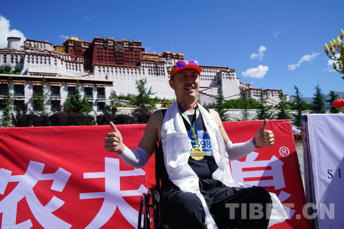 布達(dá)拉宮終點(diǎn)處人頭攢動(dòng),工作人員為每一位完賽選手獻(xiàn)上哈達(dá)、掛上獎(jiǎng)牌,和選手們一起享受拉薩半程馬拉松挑戰(zhàn)完成的滿足與快樂。來自山東濟(jì)寧的任先振是本屆拉薩半程馬拉松唯一一位輪椅半程選手,他告訴記者,這一路他不僅沒有高反,且因?yàn)槭亲约簠⒓舆^最高海拔的半程馬拉松而更加富有激情,在拉薩他感受到了許多來自藏族同胞的關(guān)心與溫暖,來到高原前他已經(jīng)報(bào)名了拉薩旅游團(tuán),他要去看看屬于雪域高原的美景。