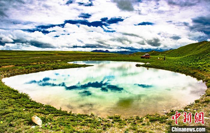 圖為藍天倒映在眼睛湖中。 孫睿 攝
