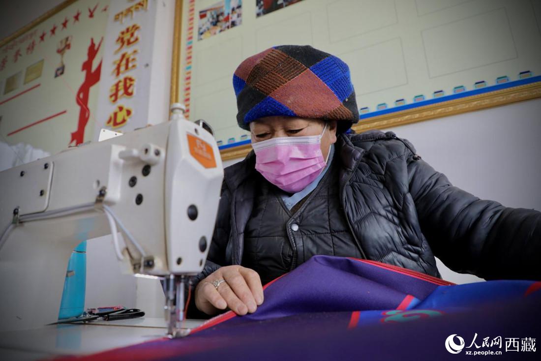 農(nóng)牧民專業(yè)合作社里的村民正在制作門簾。人民網(wǎng) 次仁羅布攝