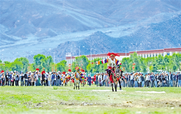 7月24日,在西藏自治區(qū)拉薩市曲水縣曲水鎮(zhèn)茶巴朗村村民身著節(jié)日盛裝進(jìn)行賽馬和馬術(shù)表演歡度“望果節(jié)”。[詳細(xì)] -