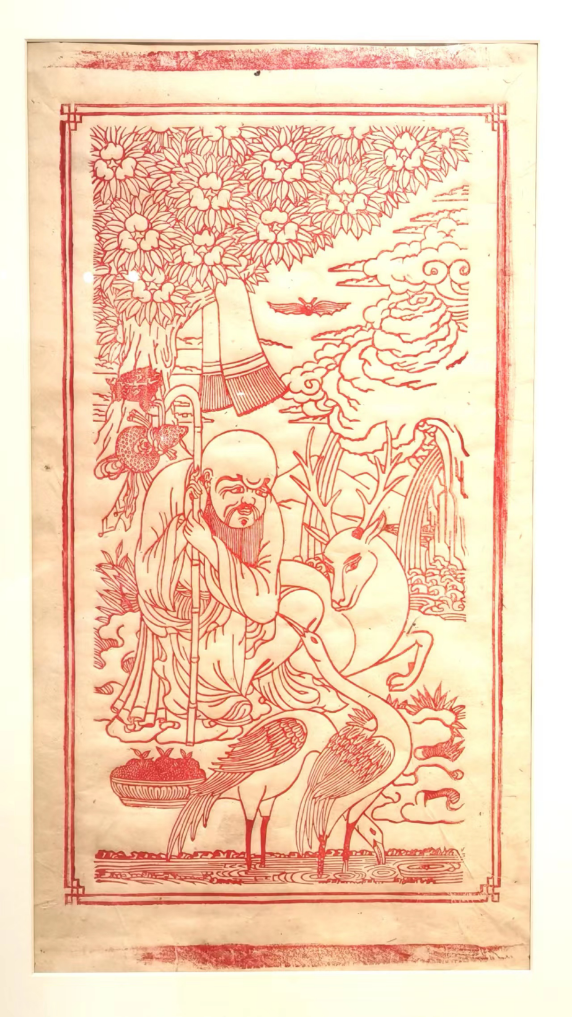 雕版拓片《六長壽》,印有長壽巖、長壽老人、長壽水、長壽樹、長壽鶴、長壽鹿六樣元素,是西藏經典的風俗畫題材,其中長壽老人還有內地壽星形象的標志性凸額。由于寓意吉祥,它出現(xiàn)在唐卡、家用藏式柜彩畫以及布達拉宮的壁畫上。