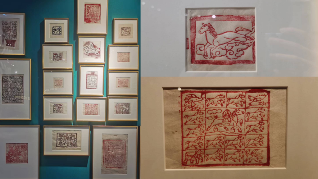 西藏懸掛山間、隨風搖曳的成串彩旗,是從古象雄時期留傳至今的祈福物——風馬旗。一組來自西藏各地的17件拓片告訴觀眾:古代的風馬旗以雕版拓印而成,其上繪馬,有的肅立、有的飛奔,有的高傲、有的溫馴,種種儀態(tài)不一,還有的和龍鳳虎獅一起嬉戲。