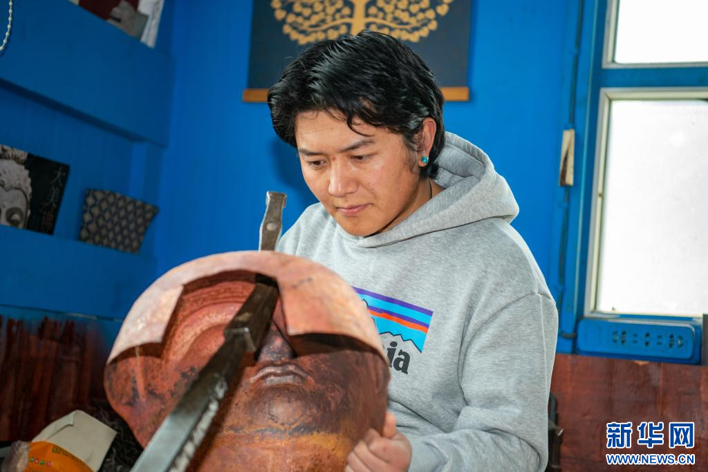 10月17日,西藏昌都市非物質文化遺產(chǎn)代表性項目“巴爾瑪錘揲法造像技藝 ”代表性傳承人嘎瑪次仁朗加在打制西藏傳統(tǒng)造像。新華網(wǎng) 旦增努布 攝
