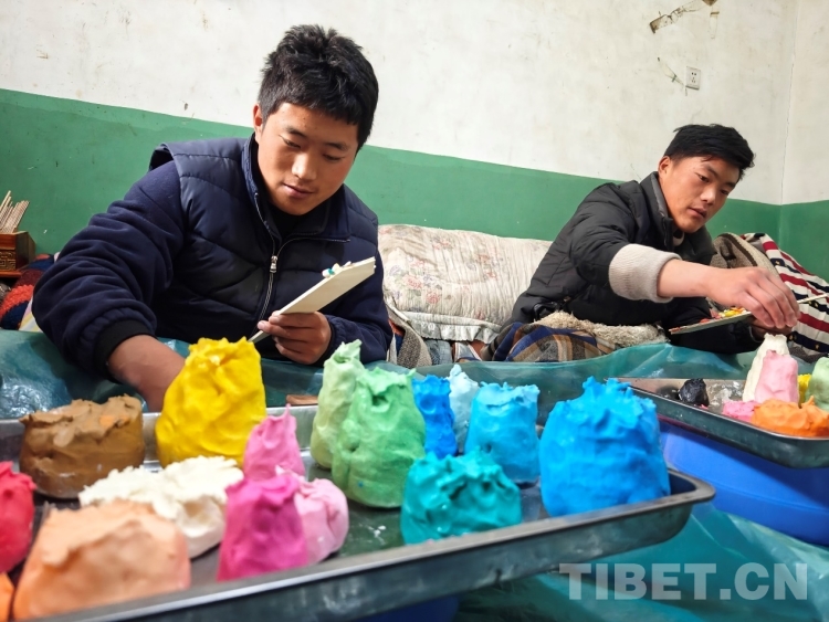 丹增朗杰每天和爸爸、大哥一起從早上8點左右開始捏制,一直持續(xù)到深夜24時許,按圖案復雜程度,一天可以捏制近7到10余對酥油花?!半m然有點辛苦,但我很喜歡寒假和家人一起來拉薩制作酥油花。”丹增朗杰說,他從14歲開始學習制作酥油花,覺得靠自己的勞動掙錢能讓自己擁有成就感。