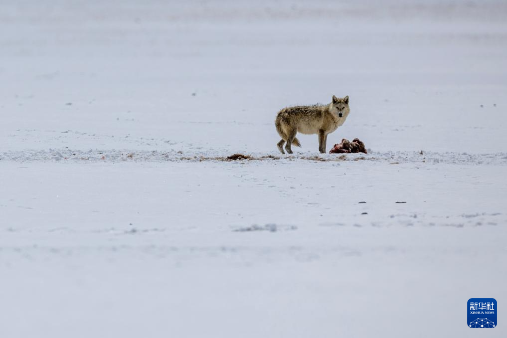 在西藏那曲市尼瑪縣境內(nèi)的羌塘國家級自然保護(hù)區(qū)核心區(qū),一只狼在進(jìn)食(5月9日攝)。新華社記者 姜帆 攝 ??